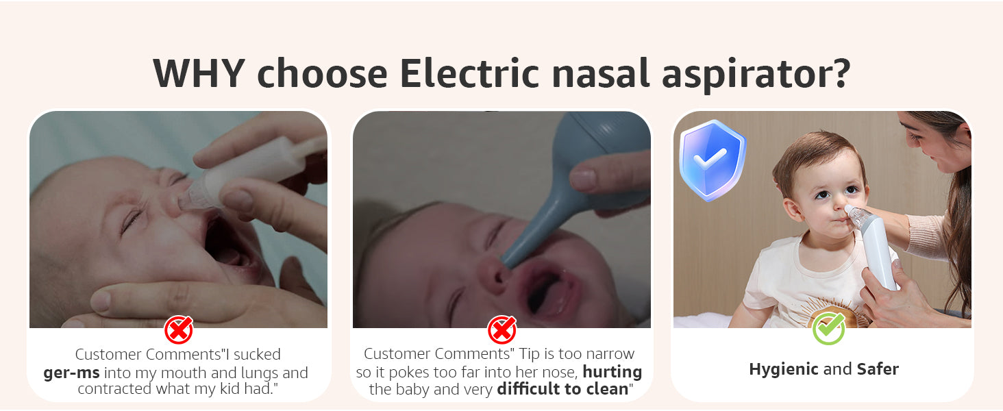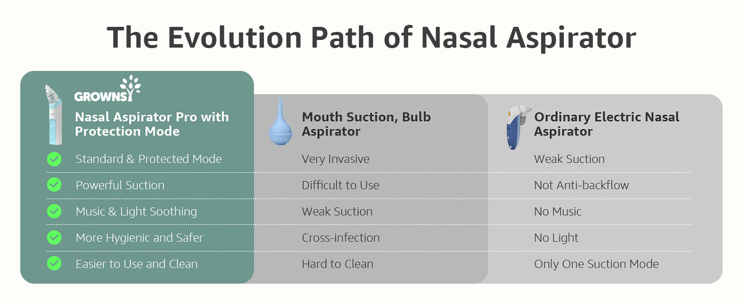 Grownsy Nasal Aspirator features adjustable hospital-grade suction, ensuring quick and effective nasal cleaning for your baby. No more struggling with clogged noses.